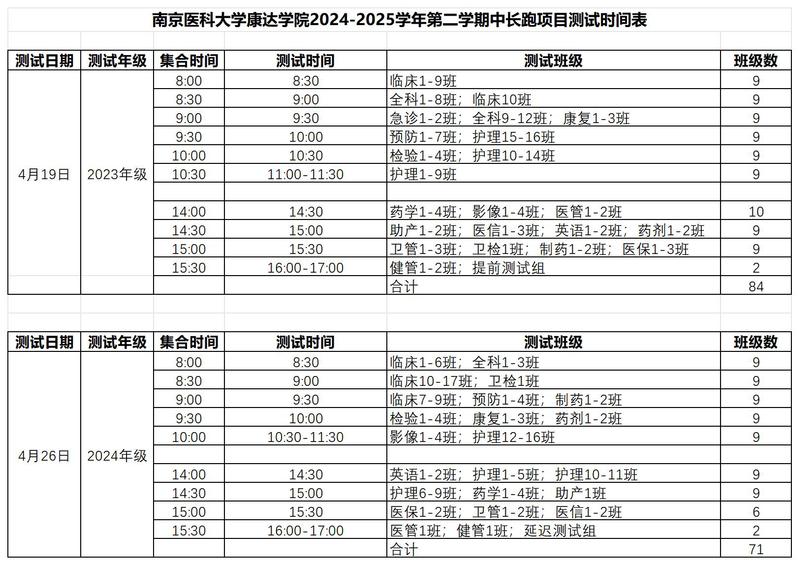 根据教育部《国家学生体质健康标准》相关规定,体育部体质测试中心拟定于2025年4月19日和4月26日开展2024-2025学年第二学期《体育》课程中长跑项目期末考试暨《国家学生体质健康标准》测试,现将相关事宜通知如下: