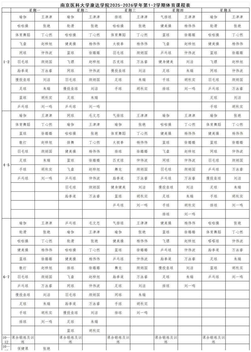 | 南京医科大学康达学院2025-2026学年第1-2学期体育课程表 | |||||
